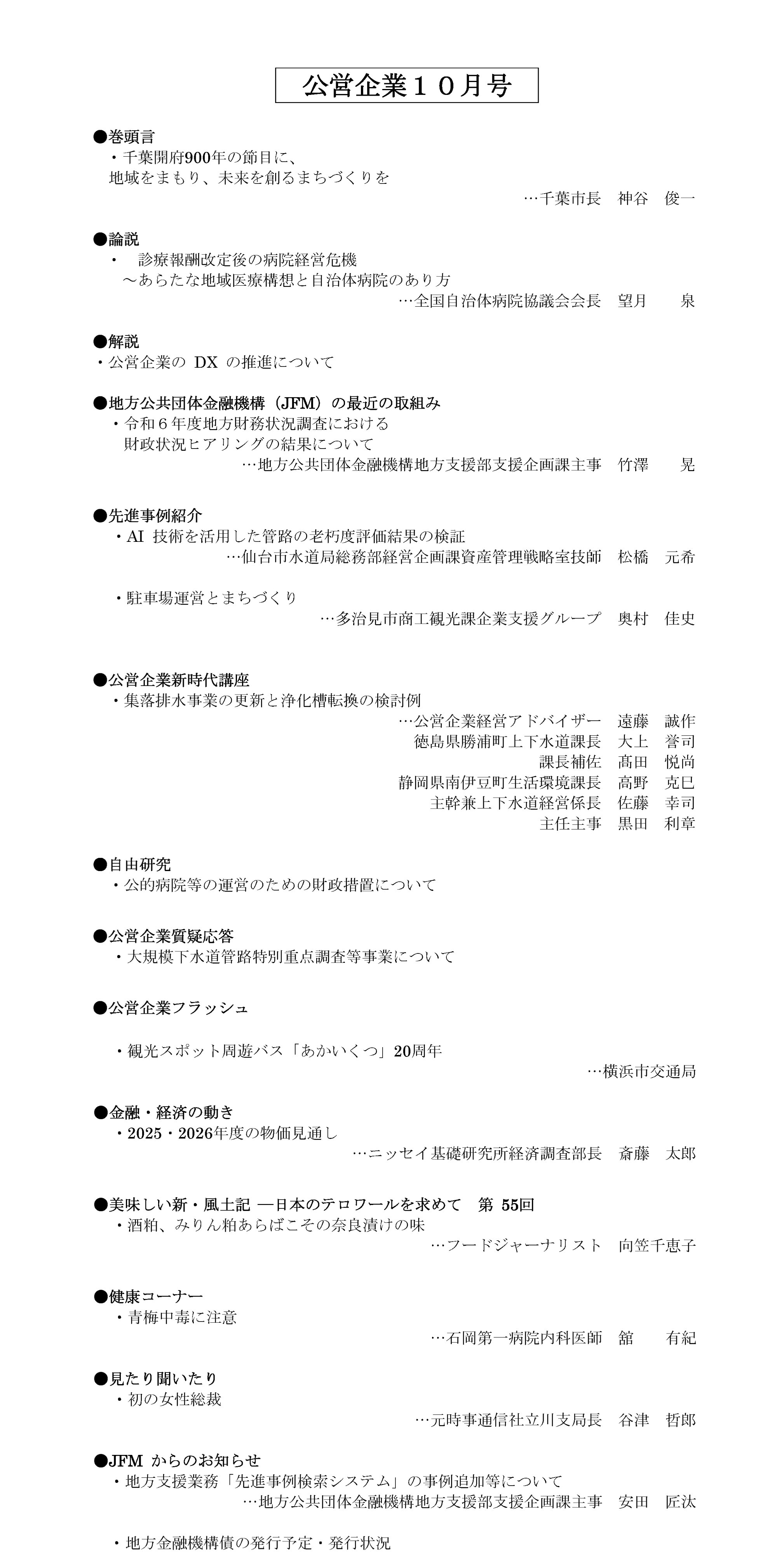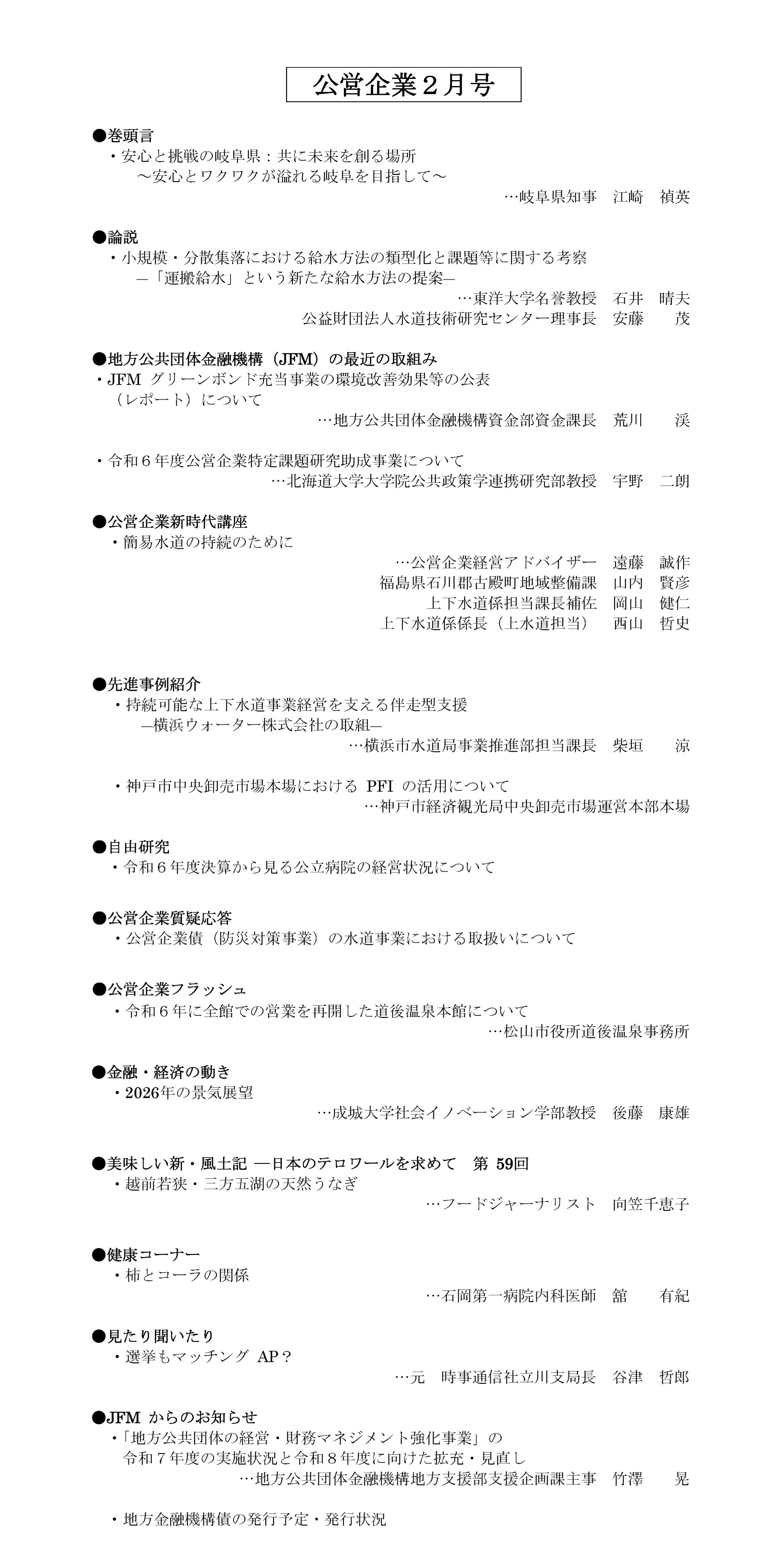 ◎巻頭言・論説・解説 ◎JFM最近の取組み◎先進事例紹介◎公営企業新時代講座◎自由研究◎公営企業質疑応答◎公営企業フラッシュ◎金融・経済の動き◎美味しい新・風土記-日本のテロワールを求めて◎健康コーナー・こころの健康コーナー◎見たり聞いたり 他